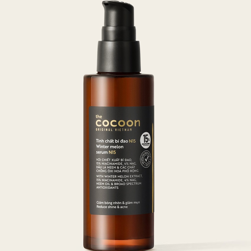 Tinh chất Serum bí đao N15 Cocoon 70ml Thuần Chay 15% niacinamide tinh khiết, 4% NAG phối hợp cùng dầu lá neem và các chất chống ôxy hoá phổ rộng giảm bóng nhờn và cải thiện tình trạng mụn.