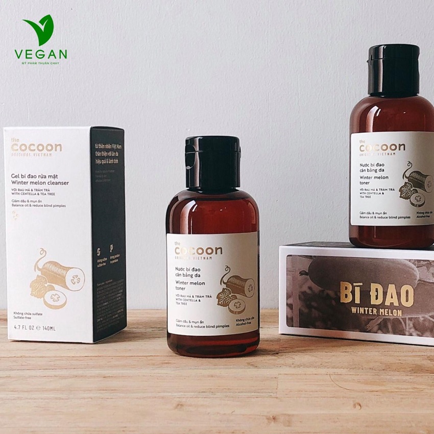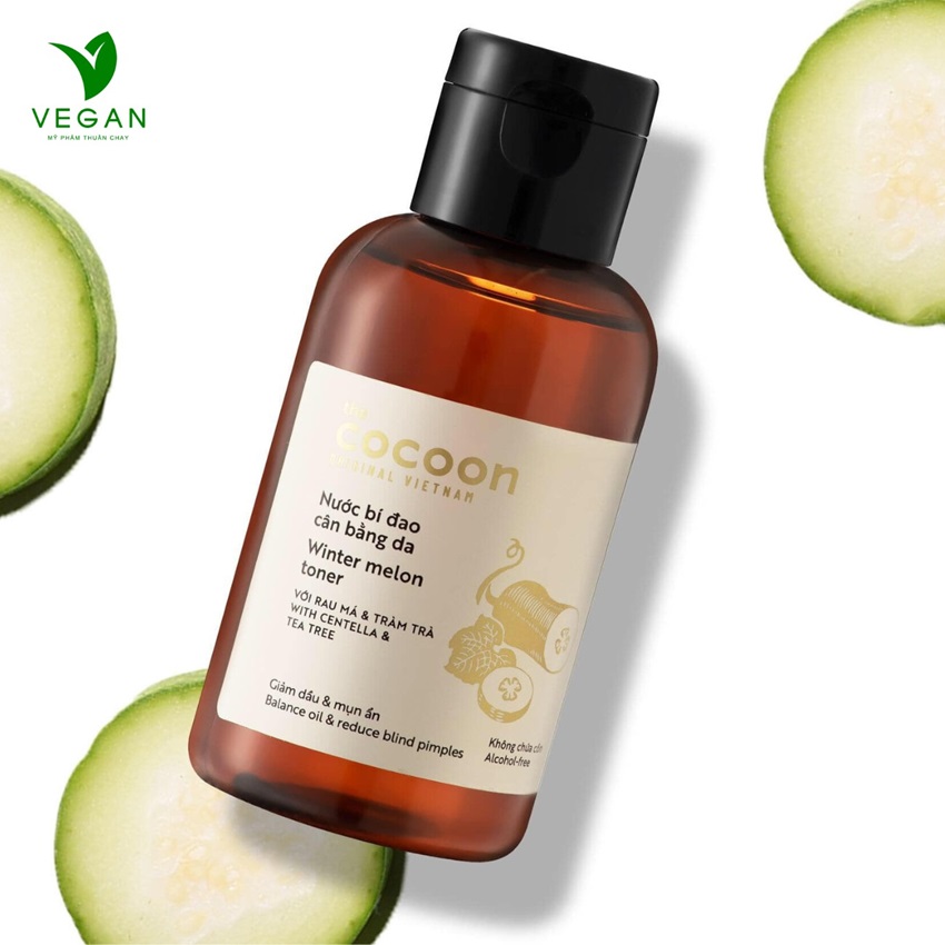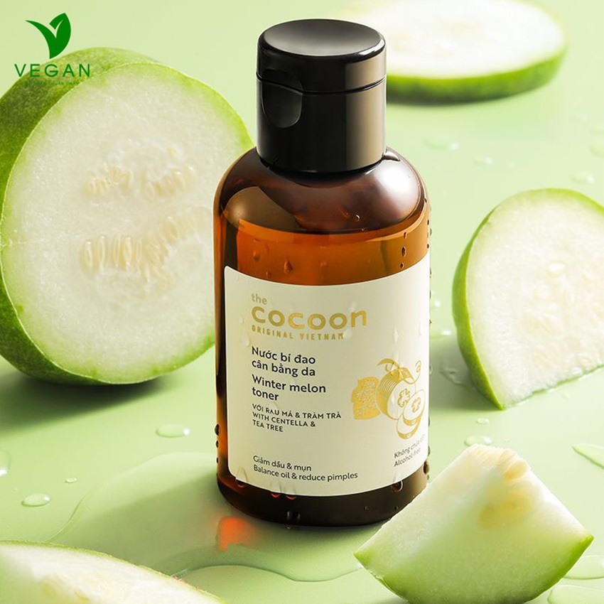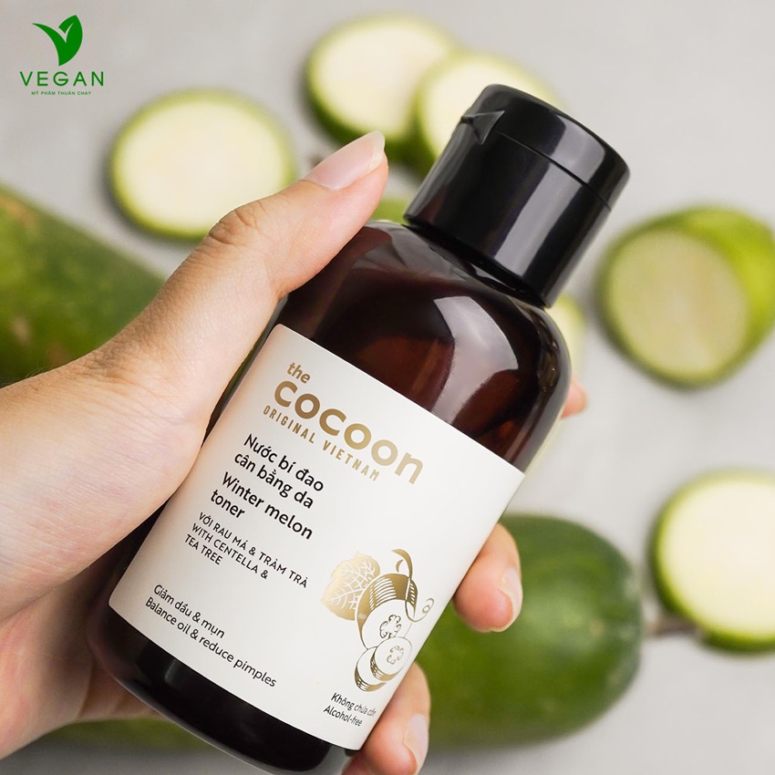 - Nước cân bằng da Cocoon chứa các thành phần tự nhiên như bí đao, rau má và tràm trà.