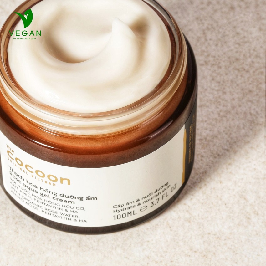 Thạch hoa hồng COCOON dưỡng ẩm thầy chay với kết cấu mọng nước mang nhiều dưỡng chất từ nước hoa hồng hữu cơ kết hợp với nam châm dưỡng ẩm Pentavitin, các axit amin và HA, thạch hoa hồng sẽ nuôi dưỡng và khóa ẩm suốt 24 giờ, mang lại làn da đầy đặn, mềm mượt và mịn màng.