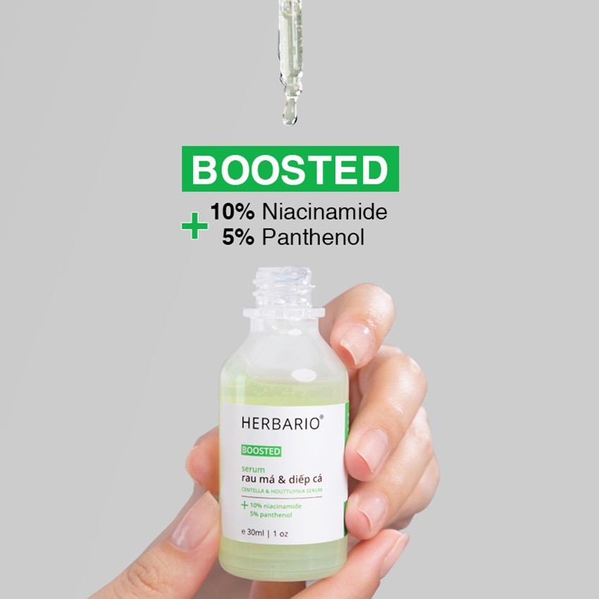 BOOSTED Serum Rau má & Diếp cá Herbario 30ml bản nâng cấp tăng cường +10% Niacinamide, +5% Panthenol đẩy mạnh quá trình làm sạch mụn ngăn ngừa mụn hình thành, đồng thời làm dịu da và mờ thâm.